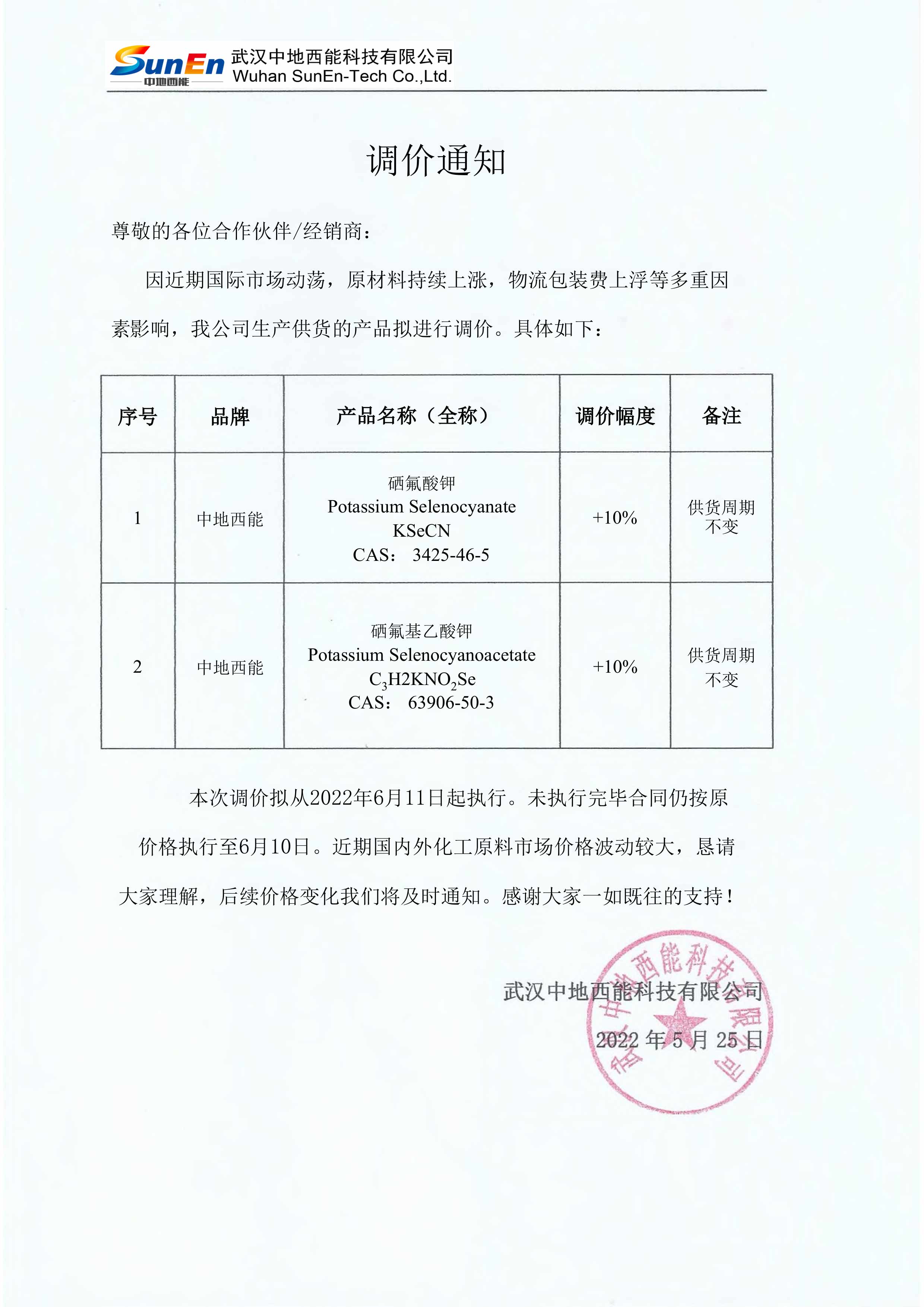 本次調(diào)價擬從2022年6月11日起執(zhí)行。未執(zhí)行完畢合同仍按原價格執(zhí)行至6月10日。近期國內(nèi)外化工原料市場價格波動較大,懇請大家理解,后續(xù)價格變化我們將及時通知。感謝大家一如既往的支持!